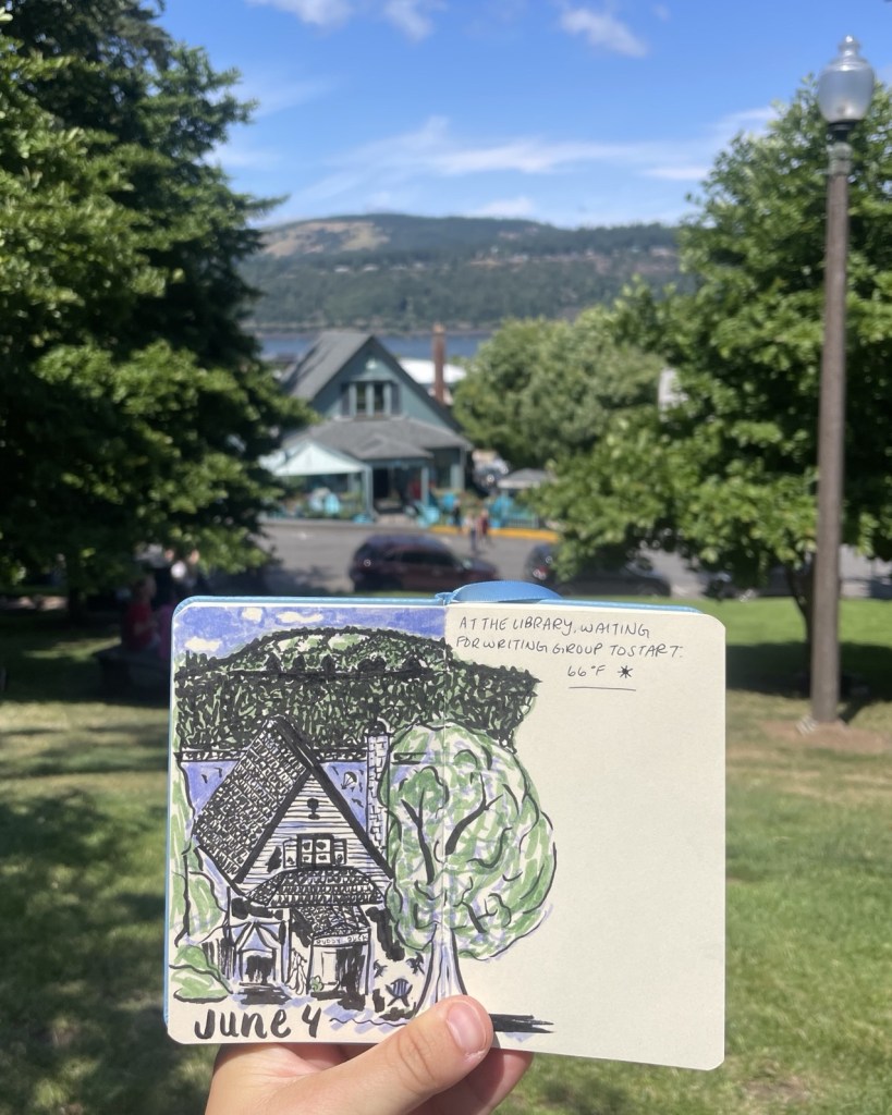 In some of the videos I watched about sketchbooking, the artists were reflecting on how sketching the scene in front of them or a live subject allows them to remember the moment more vividly. That was certainly true for me with this sketch. I love that I captured the blue Adirondack chairs in front of the store, the clear cuts across the river, and the kiteboarder, too. Because of this sketch, I see these quintessential Hood River elements in new, more meaningful ways. I can already see how this sketchbook will become a visual diary, bringing me back in time in a way that my written journal does not.
